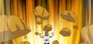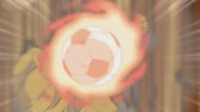 Hace aparecer y levitar unas piedras, luego chuta el balón que va rebotando sobre las piedras, a la vez que coge potencia y va dirigido hacia la portería.